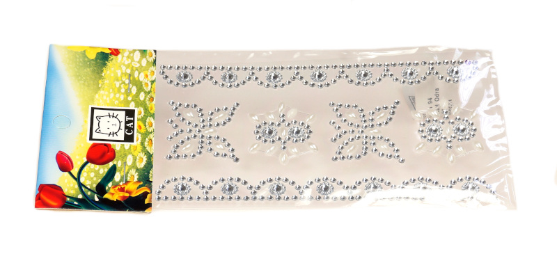 Opakowanie dekoracyjnych cyrkonii w srebrnym kolorze. W paczce znajduję się 12 sztuk naklejek w kształcie motylków, ozdobnych pasków i kwiatków. Z łatwością można przykleić je do różnych powierzchni takich jak np. papier, szkło, tkanina lub drewno. W zależności od potrzeb i kreatywności można wykorzystać je na wiele ciekawych sposobów.