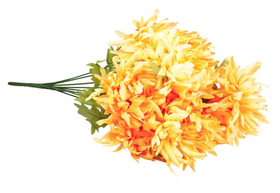 Chryzantema w bukiecie, wykonana została w kolorze pomarańczowym. Bukiet sztucznych chryzantem zawiera 9 gałązek z kwiatami. Podstawą każdej łodygi jest drut florystyczny (powlekany). Łodygi można z łatwością modelować w dowolnym kierunku, nadawać jej różny kształt, a także przycinać za pomocą sekatora lub nożyczek do drutu. Łodygi pokryte zostały zielonymi listkami, dzięki czemu nie ma luk między łodygami.