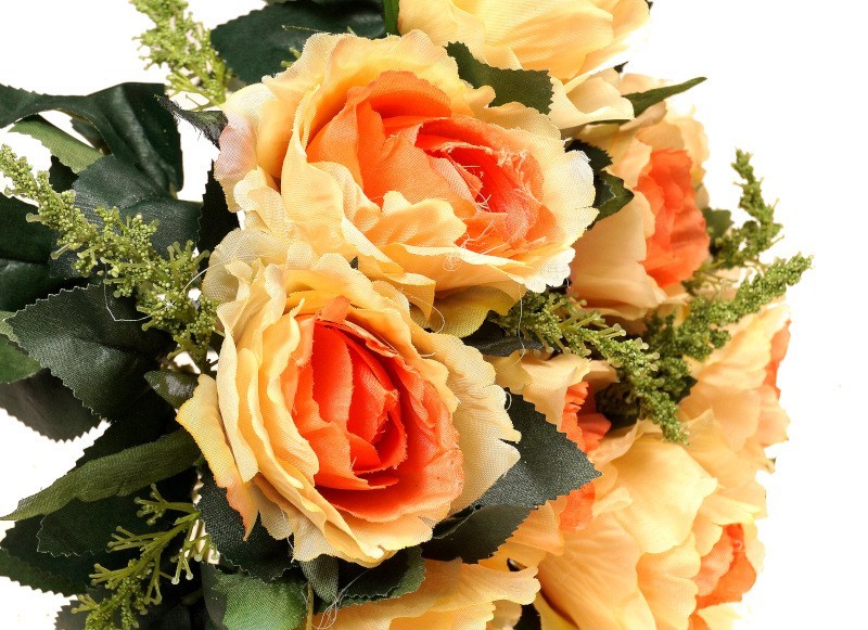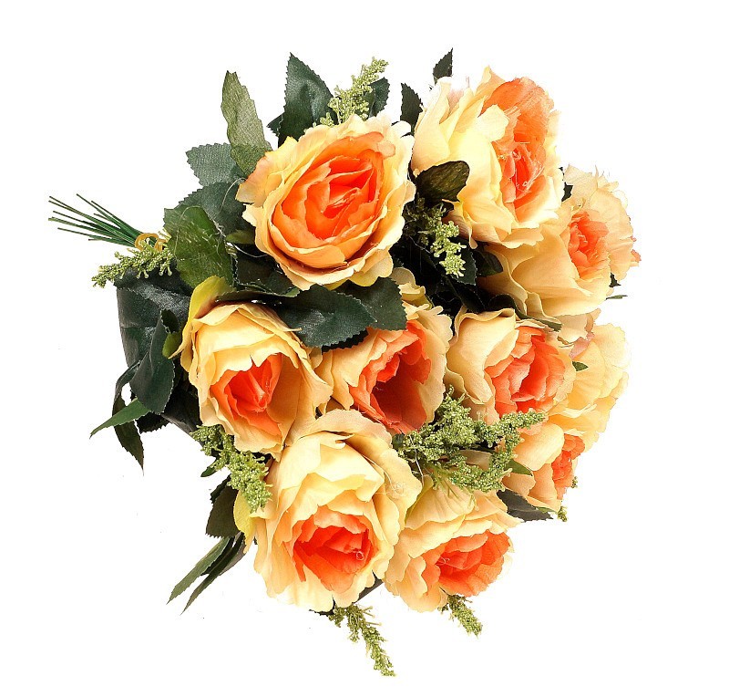 Kwiat róży w kolorze pomarańczowo – ecrue, którego całkowita długość wynosi 33 cm. Kwiat wykonany z tworzywa sztucznego. Podstawą kwiatu jest drut który trzyma go w pionie a także umożliwia wyginanie w dowolnym kierunku. Kwiaty róży stosowane przy tworzeniu kompozycji kwiatowych. Doskonale sprawdzą się do tworzenia bukietów sztucznych w gąbce florystycznej suchej. Stanowią doskonałą alternatywę kwiatów żywych. Wdzięcznie prezentują się w dekorowaniu wnętrz. W zestawie 12 pojedynczych róż, produkt nie jest bukietem.