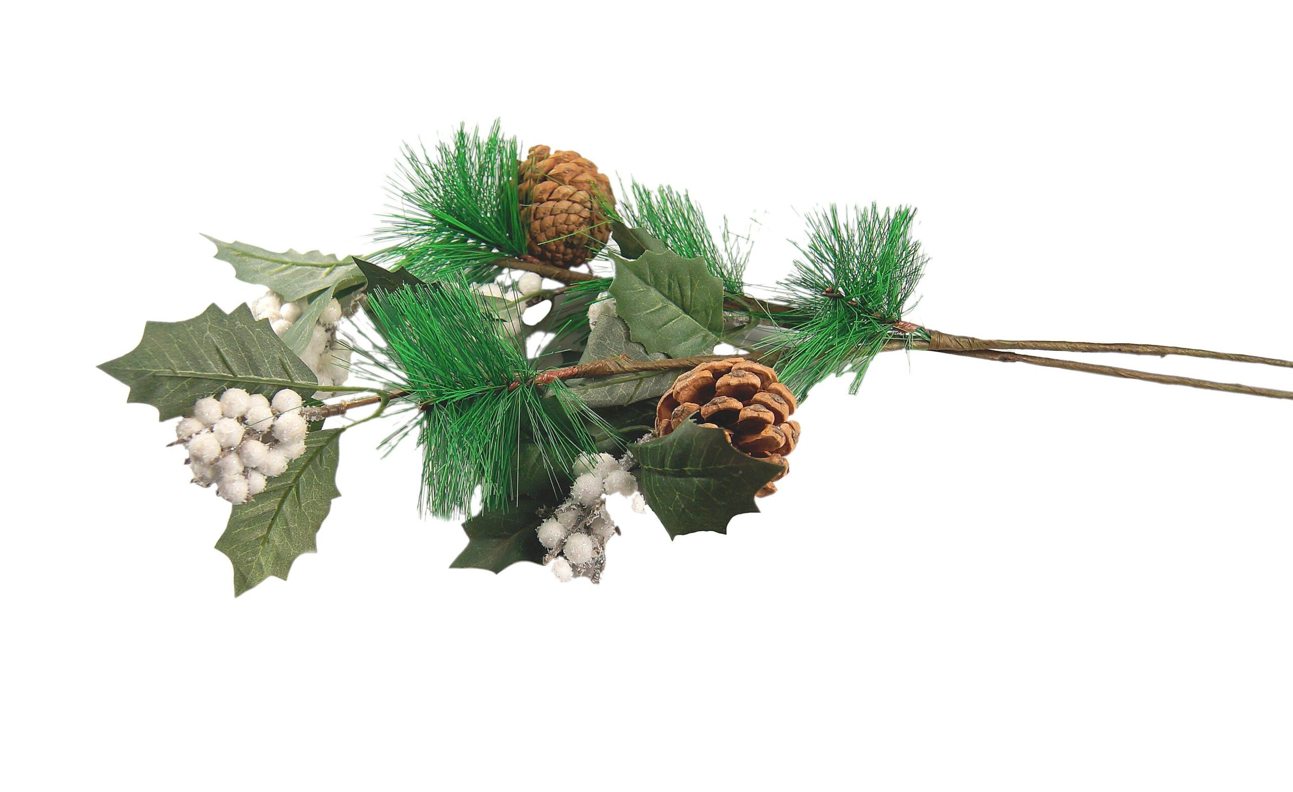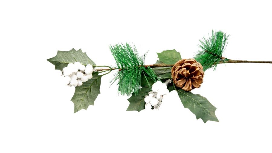 Każda dekoracja, stroik czy kompozycja, potrzebuje dodatków, które wypełnią i scalą kompozycję. W tej roli doskonale spełni się gałązka sosny. Sona wykonana z materiałów sztucznych. Jej podstawę stanowi drut florystyczny, który utrzymuję gałązkę pionowo i dodatkowo pozwala nadać jej dowolny kształt poprzez przegięcie, a nawet przycinanie do dowolnej długości. Drut florystyczny został opleciony brązowym materiałem w celach estetycznych, Na górze znajdują się liście oraz igły sosny. Całość przyozdobiona została piękną szyszką i białymi, omszonymi kuleczkami.