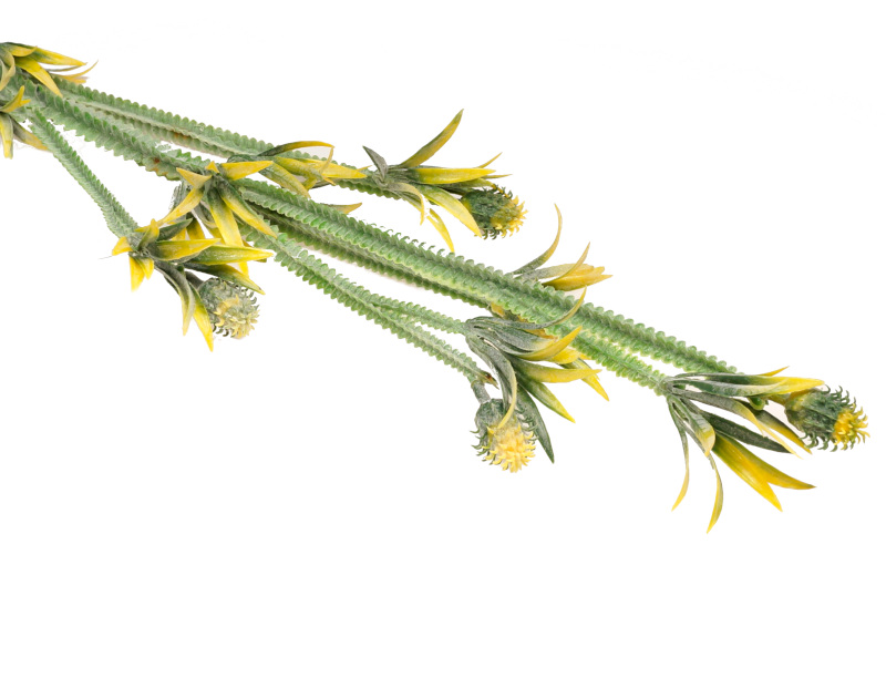 Sztuczne gałązki ostu pakowane po 6 sztuk. Długość gałązki wynosi ok. 70 cm. Z głównej gałązki wyrastają 4 pędy z główkami kwiatów i żółtymi listkami. Całość pokryta jest drobnym, miękkim meszkiem, który sprawia, że roślina prezentuje się bardziej naturalnie.
