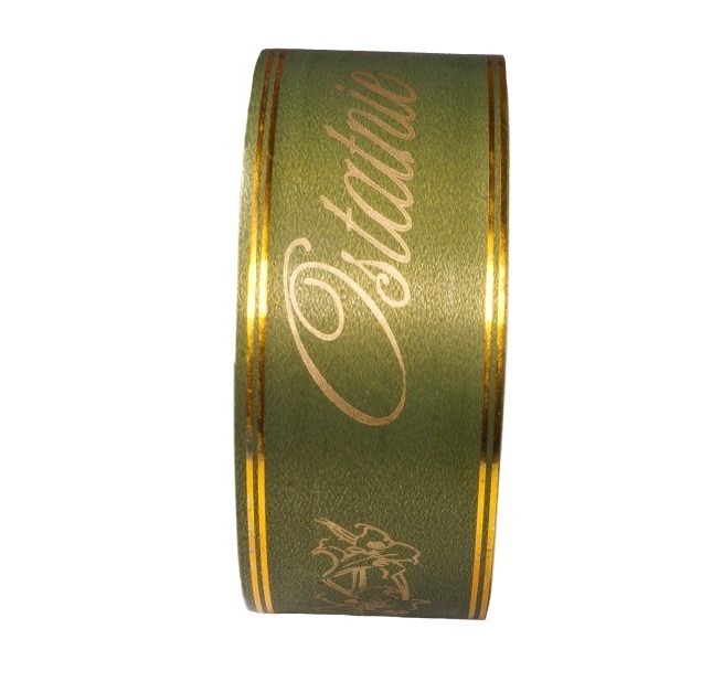 Oliwkowa taśma ze złoto-czarnym napisem ”Ostatnie pożegnanie” do wiązanek pogrzebowych. Wymiary wstążki: 5 cm x 45 m. Nada wiązance, eleganckiego charakteru. W naszej hurtowni florystycznej szeroki wybór taśm żałobnych o różnych wymiarach i wzorach. Będą one dobrym dopełnieniem zarówno dużych wiązanek, jak i pojedynczych kwiatów.