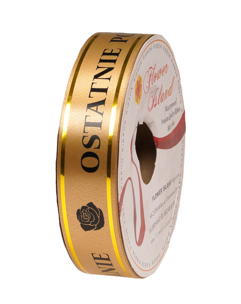 Złota taśma z napisem ”Ostatnie pożegnanie” do wiązanek pogrzebowych. Wymiary 3 cm x 45 m. Nada każdej wiązance, eleganckiego charakteru. W swojej ofercie posiadamy wiele taśm żałobnych o rożnych wymiarach i wzorach. Będą one dobrym dopełnieniem zarówno dużych wiązanek jak i pojedynczych kwiatów.