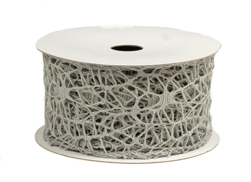 Wstążka koronka w kolorze szarym. Wymiary 5 cm x 9 m. Boki powlekane są cienkim drucikiem, dzięki czemu w łatwy sposób można ją modelować. Jej nietypowa, ażurowa struktura nada każdej kompozycji wyjątkowego i oryginalnego wyglądu. Mimo swojego delikatnego wyglądu została ona wykonana z wytrzymałych materiałów, które wyróżniają się wysoką jakością.